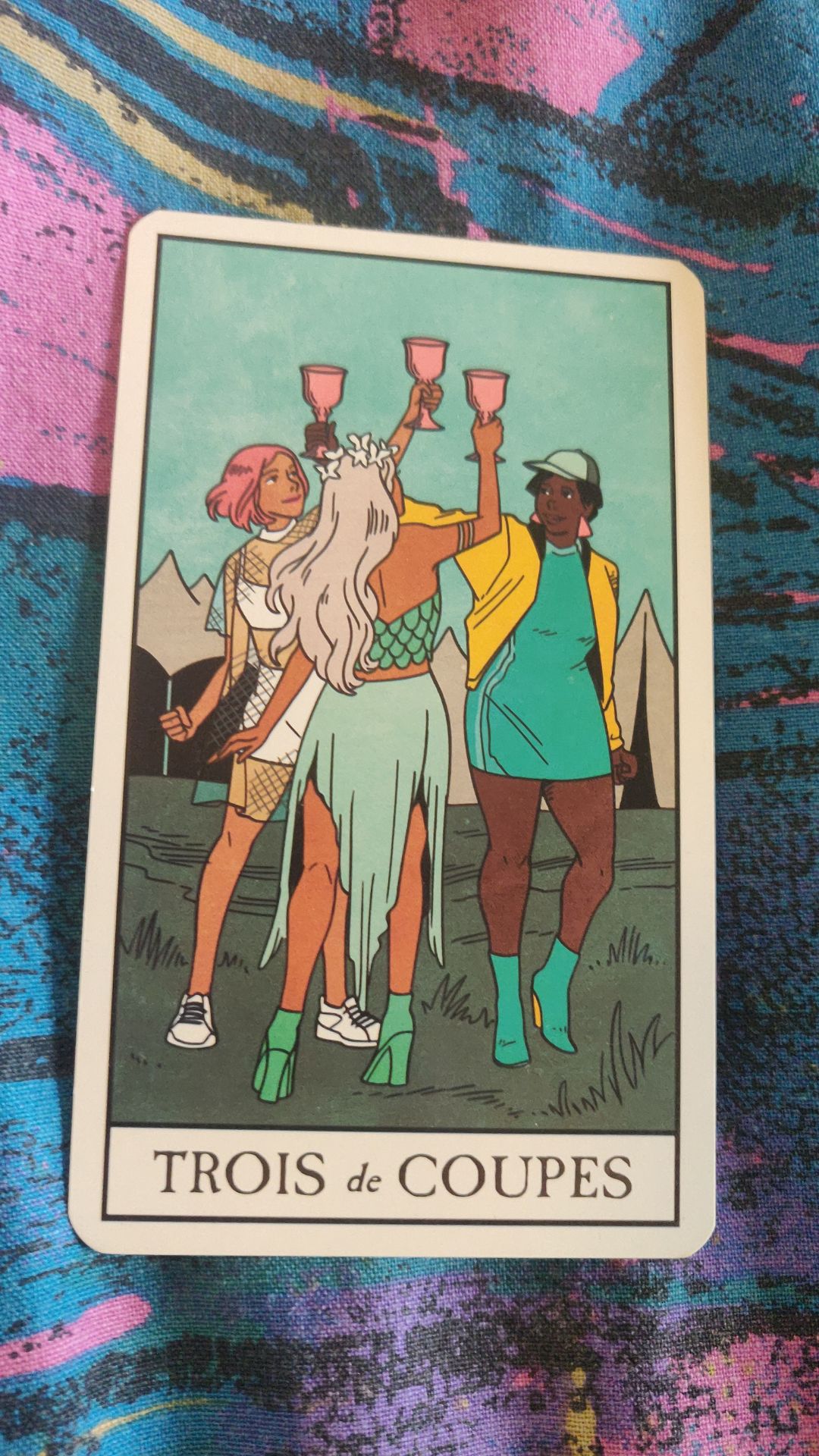 Elle a le son du rire, celui ou la gorge se déploie. Le 3 de coupe est l’une des seules carte de tarot qui célèbre l’amitié.