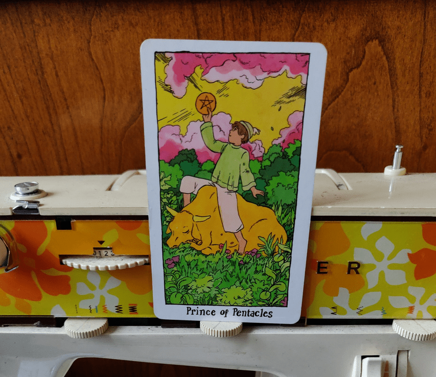 Le cavalier de pentacles est celui qui de l’équipe qui va le plus lentement. Pour moi, il évoque la détermination, les routines. Se concentrer sur ce qu’il y a à faire, prévoir et se tenir au plan. Cette carte de tarot permet d’ancrer les habitudes en couture, mais dans tout autre domaine qui nous demande de créer de ses mains.